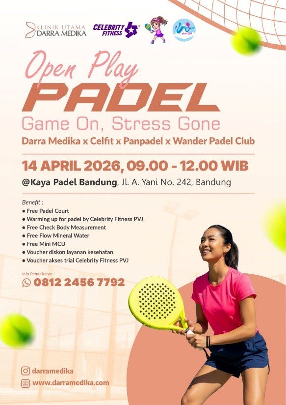 BANDUNG, 14 April 2026 – Klinik Utama Darra Medika bersama Celebrity Fitness, Panpadel, dan Wander Padel Club sukses menyelenggarakan acara olahraga bersama bertajuk “Open Play Padel: Game On, Stress Gone”. Bertempat di Kaya Padel Bandung, acara ini diikuti oleh puluhan antusias olahraga yang ingin merasakan perpaduan antara kompetisi santai dan pengecekan kesehatan preventif.