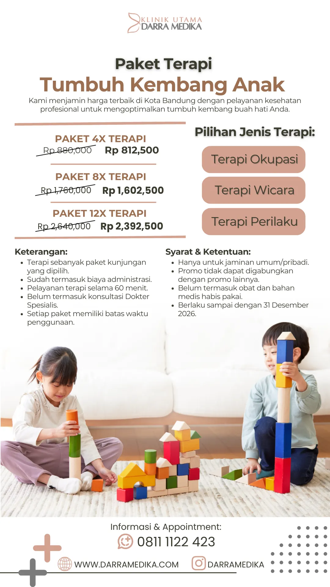 Konsultasi dan tindakan di Layanan Tumbuh Kembang Klinik Utama Darra Medika dilakukan sesuai perjanjian antara pasien dan Dokter Spesialis Anak.
